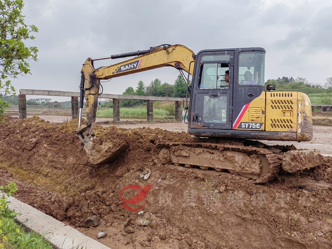 在江桥街道茅坪村宝塘支渠水毁工程施工现场,挖掘机正不停作业,将水渠损毁处进行清淤和加固。