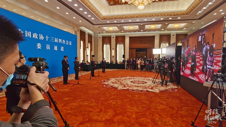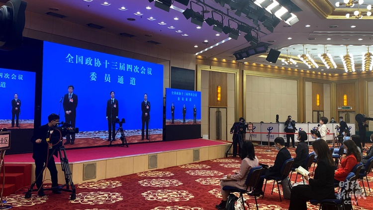 △当天14:05,全国政协十三届四次会议首场“委员通道”采访活动举行,依旧采用“隔屏对话”的网络视频采访方式。(总台央视记者郑连凯、郭茜拍摄)