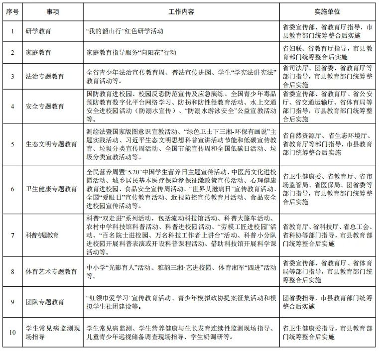 5月7日,中共湖南省委教育工作领导小组秘书组印发通知,公布《2024年省级层面涉及中小学校和教师的督查检查评比考核和进校园活动白名单》,其中督查检查评比考核事项3项,进校园活动10项。