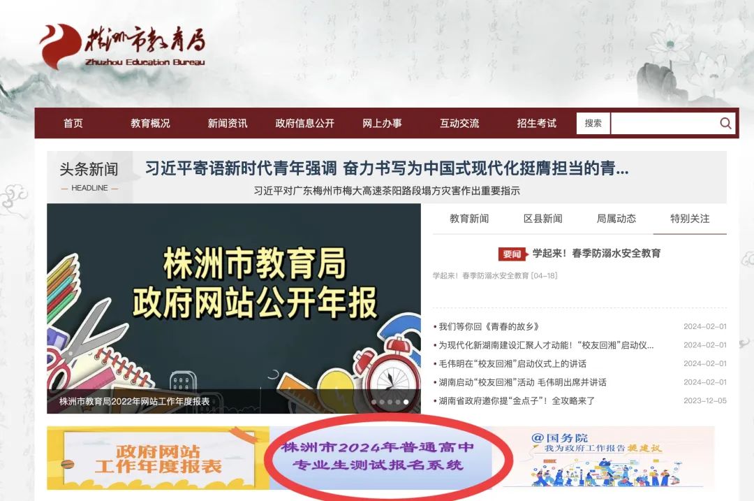 1.电脑端登录株洲市教育局网站(http://jyj.zhuzhou.gov.cn/),进入首页,点击“株洲市2024年普通高中专业生测试报名系统”(5月7日开放网上报名系统)。(建议使用谷歌、火狐、IE10及以上浏览器)