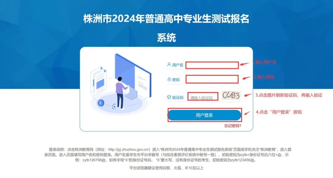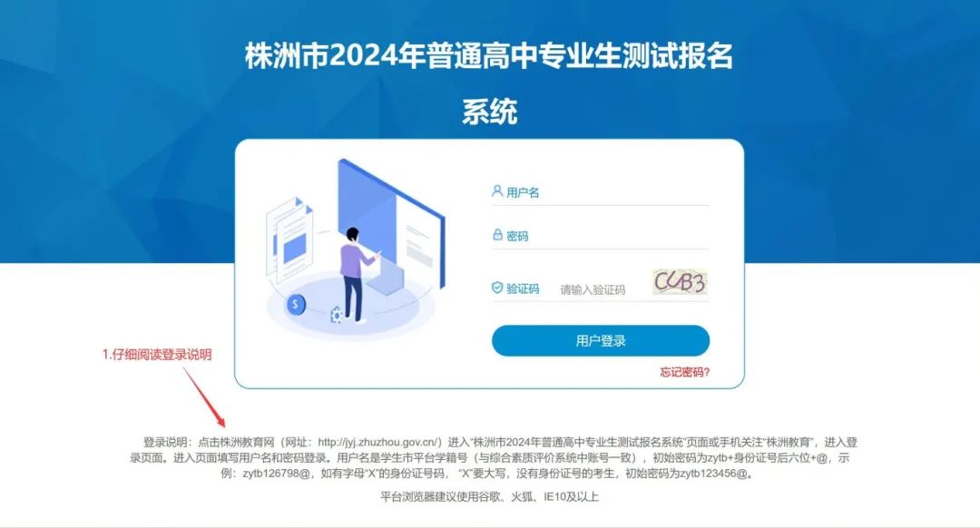 进入“株洲市2024年普通高中专业生测试网上报名系统”,请考生仔细阅读登录页面下方的说明。