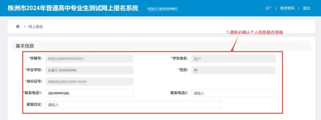 学籍号、姓名、毕业学校、性别、身份证号均为不可修改项,联系电话等信息要确保无误。请考生和家长核对以上信息,如系统信息有误,请及时与所在初中学校联系修改。