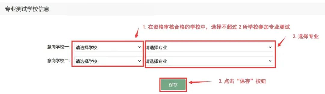 温馨提示:“意向学校”一栏显示的学校是非美术专业生资格审核合格的学校。如果在招生学校提交了资格审核资料,但是“意向学校”一栏没有显示对应学校,则是资格审核不合格。专业生测试学校确认填报后,请务必点击“保存”按钮。
