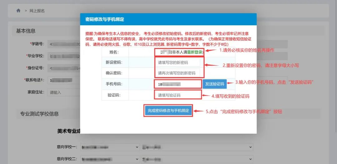 手机号码必须填写正确,手机号码用于忘记密码时接收验证码,也将用于招生录取时的联系方式。修改后的新密码,请考生和家长牢记并注意保密,因密码泄露导致的一切后果由考生承担。如忘记密码,通过登录页“忘记密码”重新设置密码。
