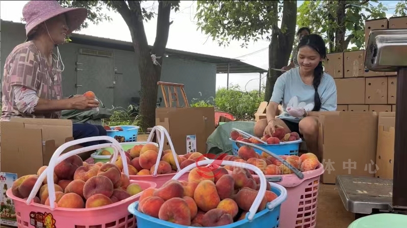 眼下正是瓜果成熟的季节,菜花坪镇攸州红鹰嘴桃种植基地里的蟠桃挂满枝头,果农们忙着采摘、分拣、装运,一派忙碌的丰收景象。