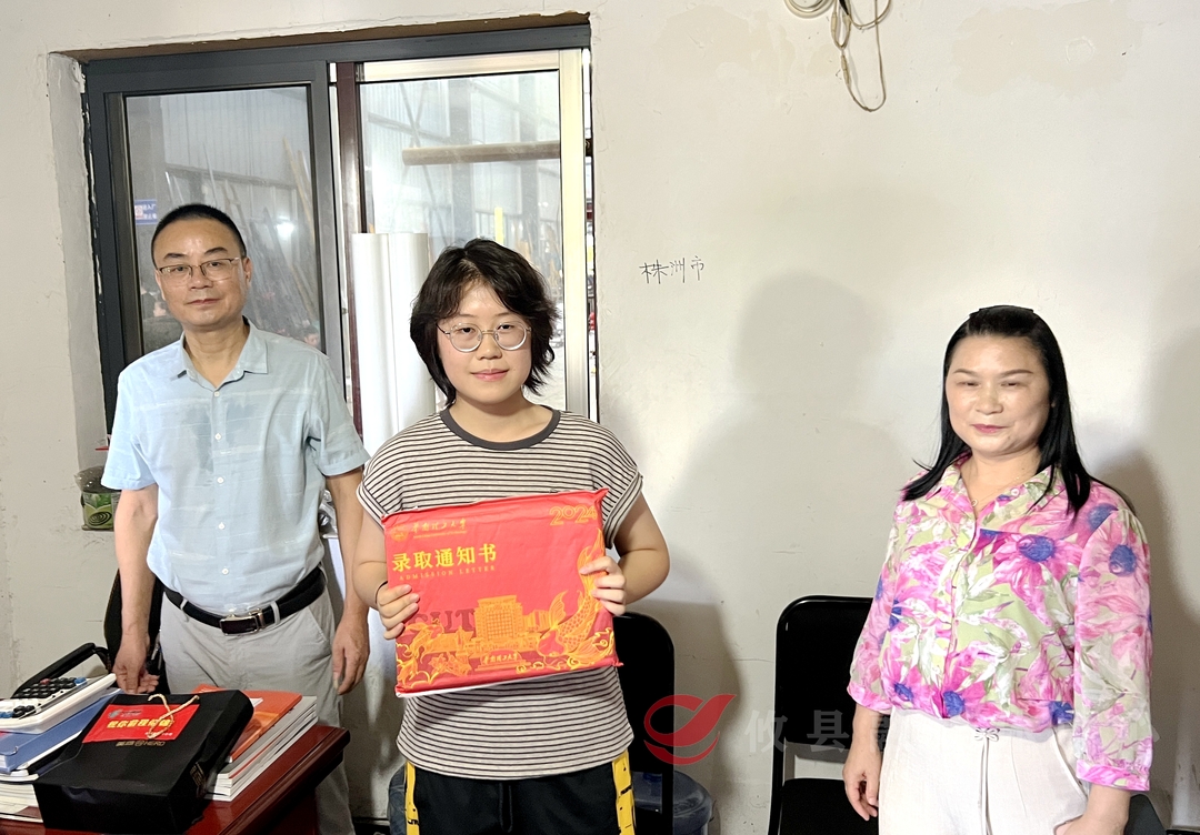 7月29日下午,一封来自华南理工大学经济与金融学院的录取通知书,被中国邮政公司攸县分公司的工作人员送到攸县一中学子尹琳珊家中。拿到心仪大学和心仪专业的录取通知书后,尹琳珊小心翼翼地将其拆开,并和父母分享这份喜悦。