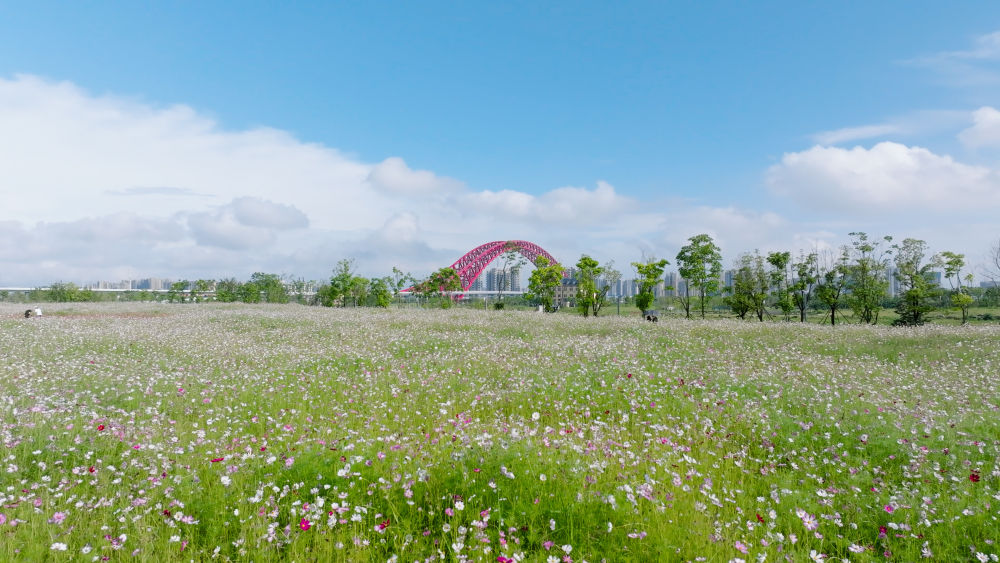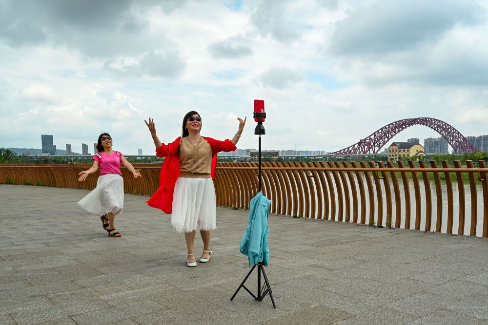 2024年6月12日,游客在清水塘公园游玩,远处是清水塘大桥。