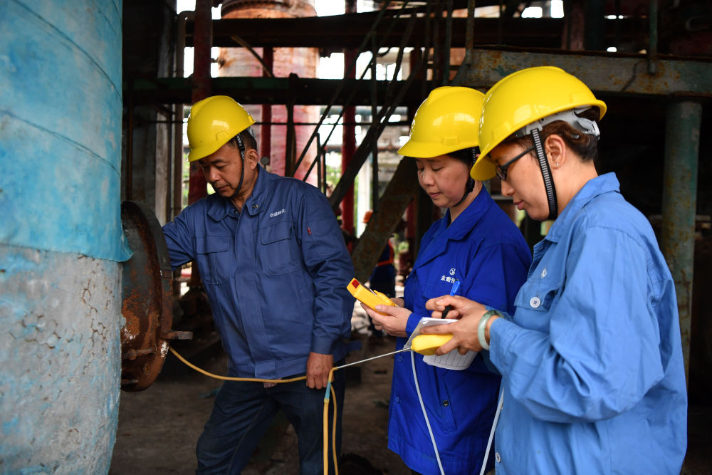 2018年4月12日,在清水塘老工业区的中盐湖南株洲化工集团,工人在检验管道内的乙炔气体浓度,为拆除做准备。