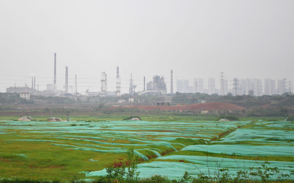 2018年4月12日,清水塘老工业区一片在进行重金属污染治理的土地,远处可以看到即将搬迁的株洲冶炼集团。