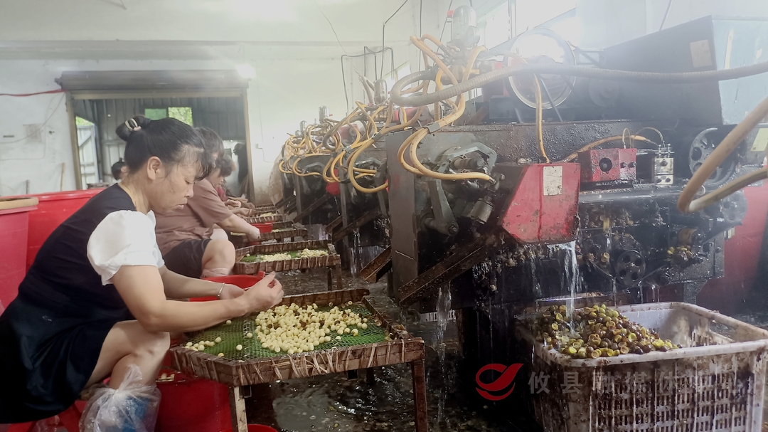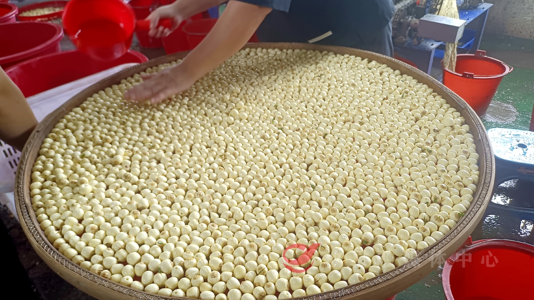 大祥村支两委在发展湘莲种植的同时,就考虑到新鲜莲子附加值低,毛利润也不高,为提高湘莲产品“身价”,大祥村引进了湘莲加工企业。在位于大祥村部的一湘莲加工厂内,十多台机器自动有序动转,一盆盆新鲜莲子经过机器的破壳、通芯、去皮、筛选后洗净进行烘干,产品就从6至7元一斤的新鲜莲子变成了收购价30至40元一斤的干莲子,许多经销商上门收购,产品供不应求。