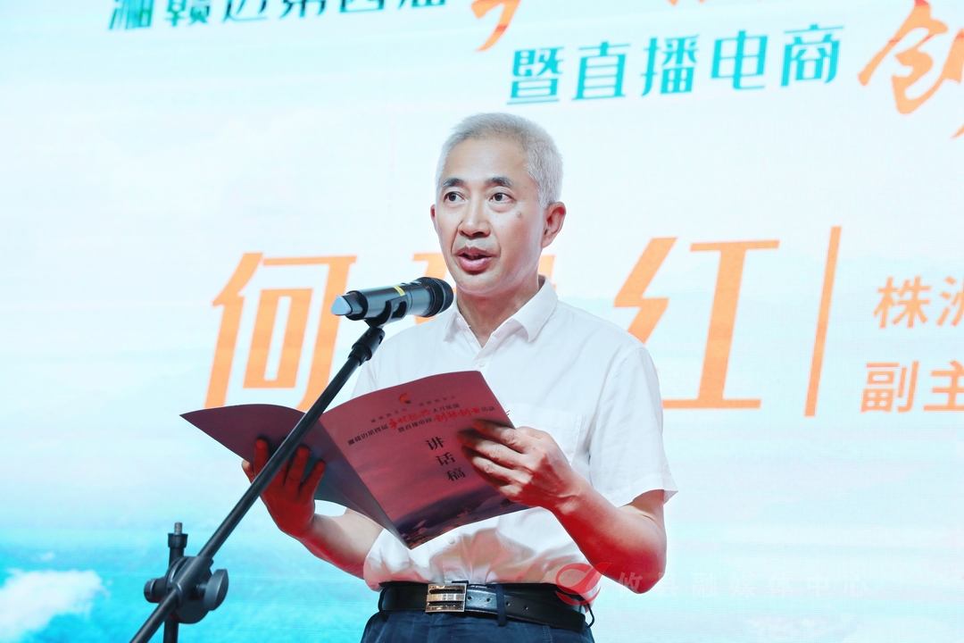市政协副主席何建红在讲话中表示,本次活动是株洲市贯彻落实湘赣边区域人才合作联席会议精神的重要行动,也是纵深推进乡村振兴战略的的有效举措。各部门、单位务必要提高认识,加强沟通协作,把握机会,提升活动影响力,汇聚起促进直播电商产业发展、推动湘赣边区域合作示范区建设的强大合力。也希望湘赣边的电商企业、直播达人们,以饱满的激情、有温度的直播,全方位宣传湘赣边独具魅力的风土人情、特色产品,推广湘赣边区域发展成果和成功经验。