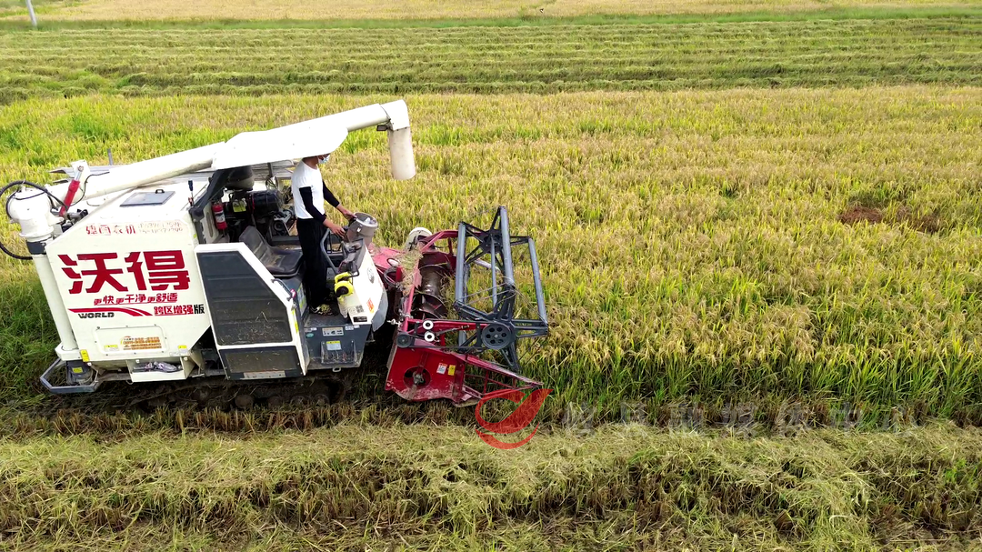 在渌田镇群新村田间地头里,金黄的稻穗沉甸甸地铺满整片田野,种粮大户陈春发正组织收割机对二茬再生稻进行收割,机器在稻田里来回穿梭,一排排水稻被整齐地割下,经过脱粒、分离、清选等流程,秸秆碎屑从后方出杂口处飘出,金黄的稻谷瞬间被“尽收囊中”。
