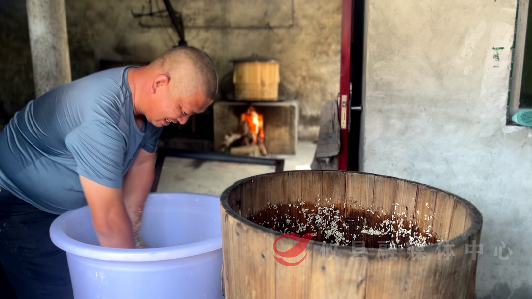 钟明波:“浸泡的时间一般控制在24到48小时,具体要根据稻米的干湿程度,还有气候的影响决定浸泡时间长短,浸泡的程度用两个手指捻一下,能够碾碎就可以去蒸熟了。”