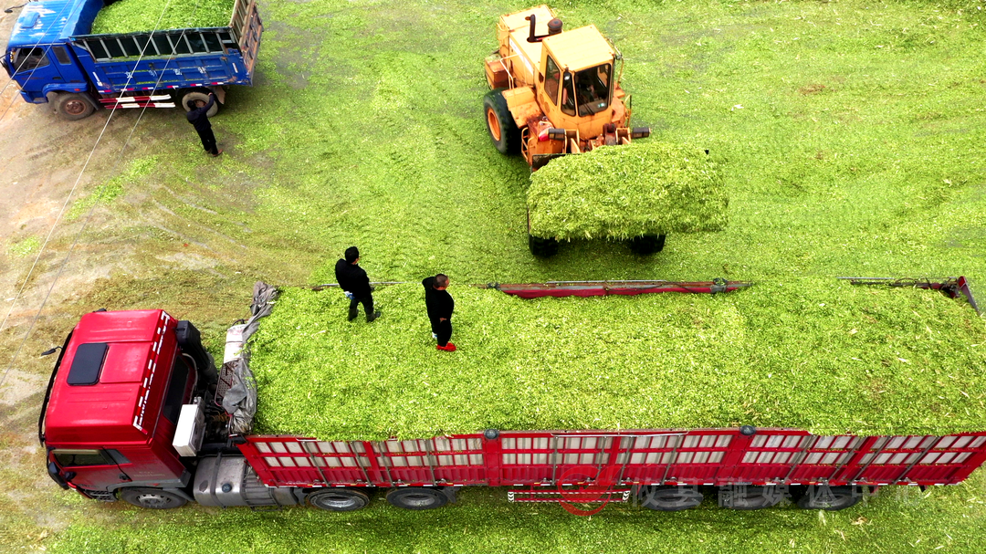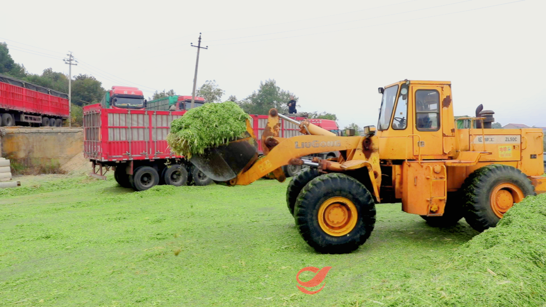 从农田收割上来的青贮饲料被临时存贮在物料场,很快一辆大型推土机将刚收割的青贮饲料装入大挂车中,被运往广州。今年,攸县蔬而康农业发展有限公司在渌田、新市、菜花坪、宁家坪等8个乡镇种植了1.8万亩青贮玉米,最后一批青贮玉米预计在大雪节气前全部收割完毕。