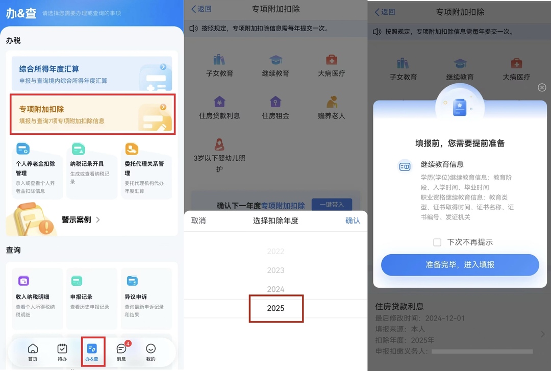 登录个人所得税App,点击首页“2025年度专项附加扣除开始确认啦”——“去确认”进入功能界面;通过“首页”——“办&查”——“专项附加扣除”进入功能界面。