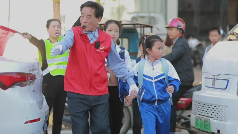“中国好人”汤其雪正在校门口义务护学。谢慧 摄