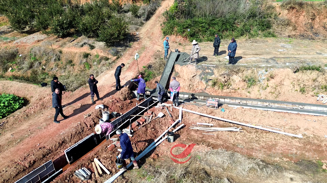 在江桥街道奥林村的田野间,一派热火朝天的忙碌场景,工人们正抓紧时间修筑水渠。