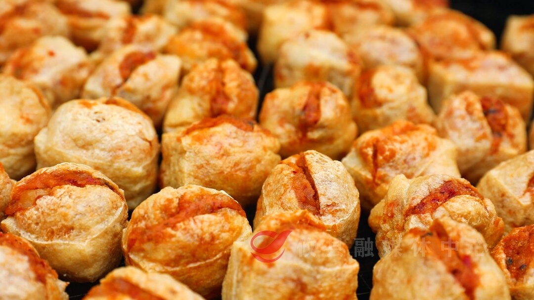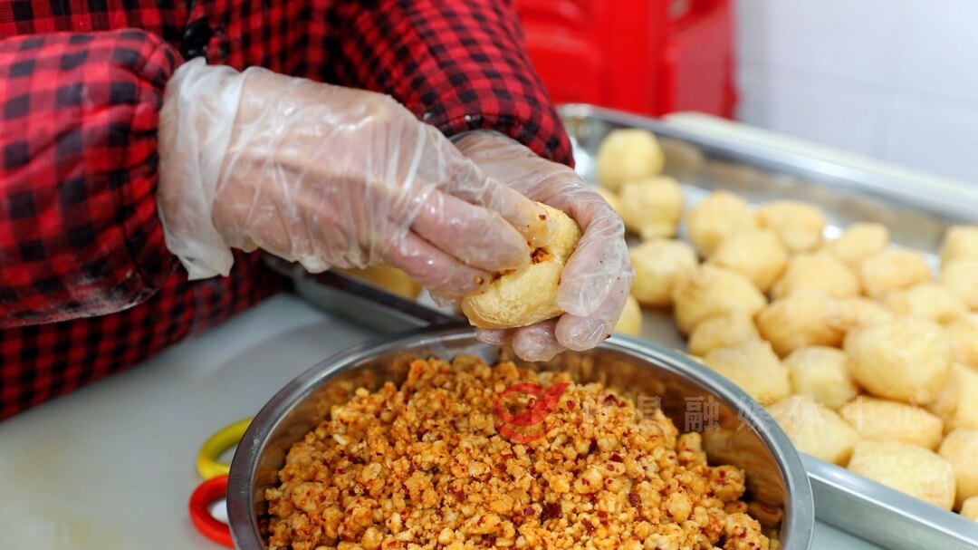制作酿豆腐,第一道工序是油炸豆腐。有着20多年酿豆腐制作经验的萧红花,对如何把油豆腐炸得个大又老,有着自己的技巧。