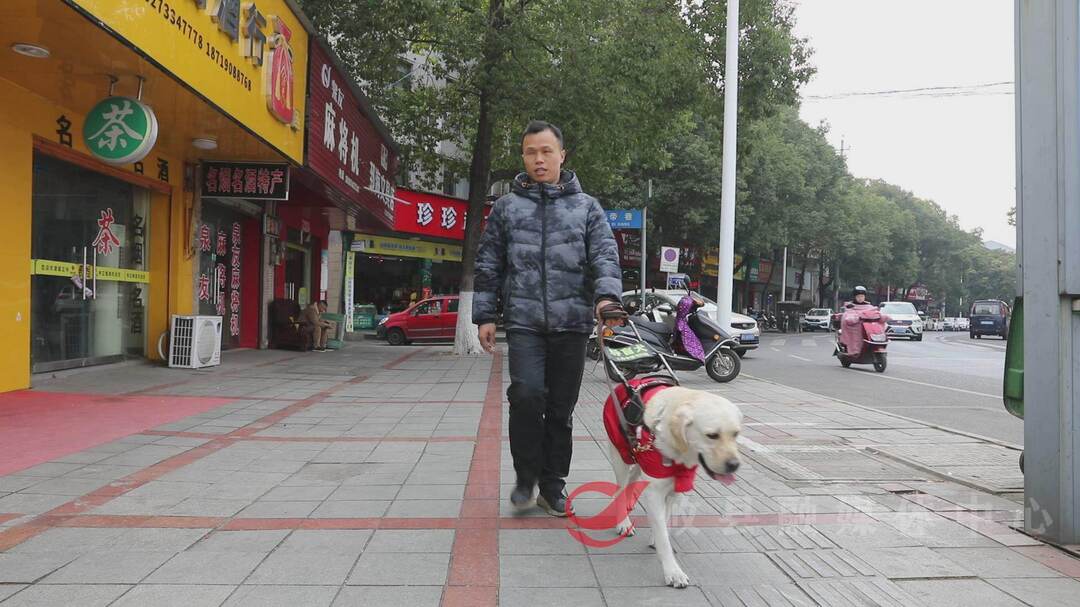 导盲犬使用者凌云:“在它的帮助下,现在在县城内的话,包括附近的攸州公园、老党校里面有大草坪的地方、河堤那边,都会带他出来散一下步,周边都可以走,他都可以很好的带我们出去带我们回来。”