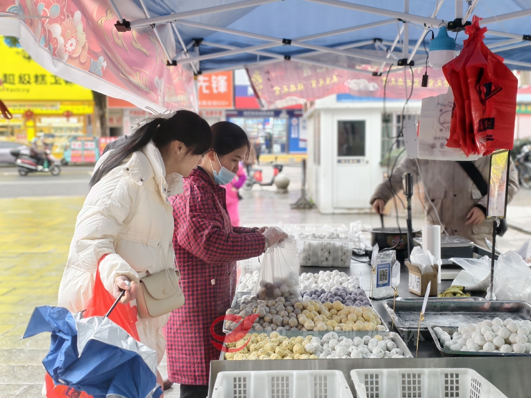 在湘东大市场门口,已经支起了不少小摊,摊位上摆满了各式各样的元宵。在现场,只见经验丰富的师傅熟练地将一小团团事先准备好的馅料和糯米粉放进裹粉机内,有芝麻馅的醇厚香甜、花生馅的浓郁香脆、香芋馅的独特馥郁。元宵就在桶内有韵律的不断翻滚、跳跃,一层又一层的糯米粉均匀地包裹在馅料上,个头逐渐变大,变得愈发圆润饱满,不一会儿,一个个白白胖胖的手工元宵就“出炉”啦,它们承载着传统的味道,为家人团聚增添一份甜蜜与温馨 。