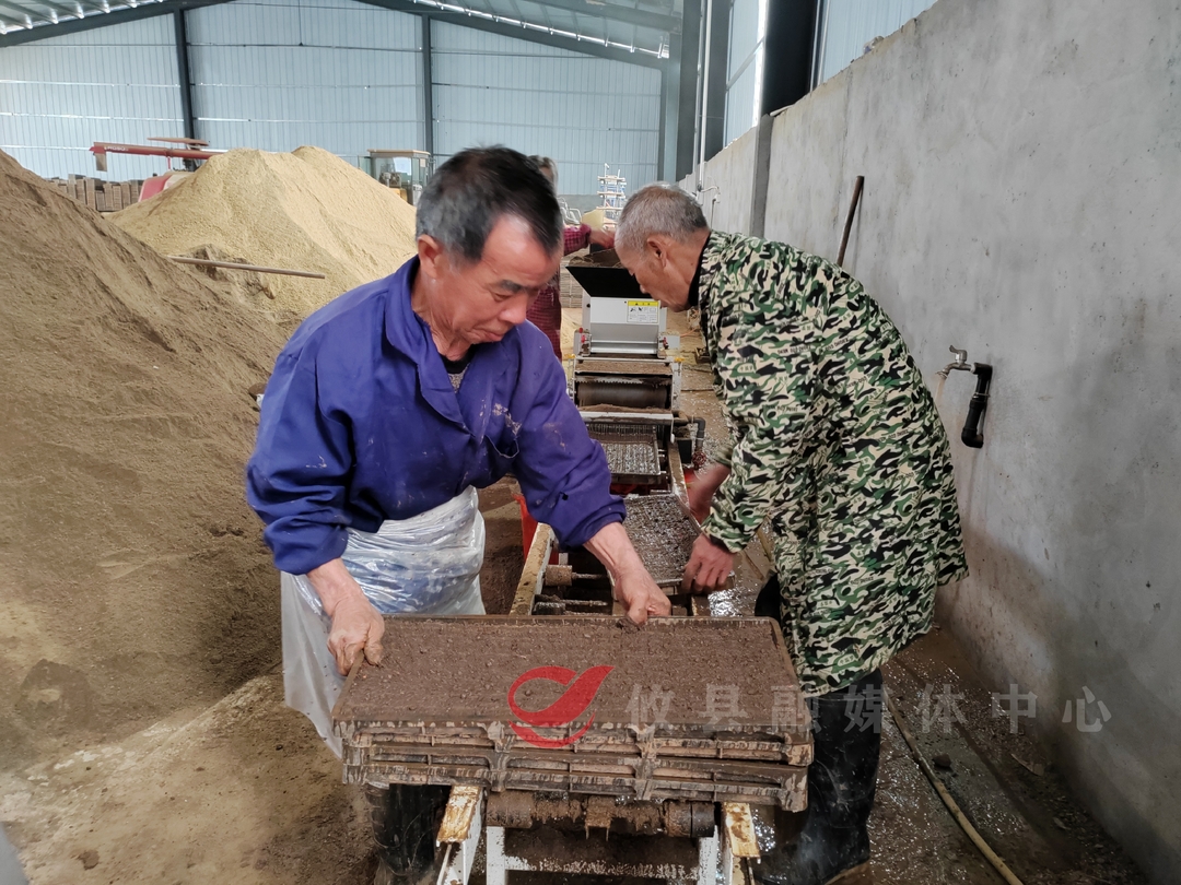 在新市镇善化村育秧工厂的生产流水线上,村民们各司其职,通过放置秧盘、底层培土、自动加湿、均匀播种、二次覆土等工序后,一个完整的育秧盘就制作完成了。随后,育秧盘被送进催芽室。等稻谷发芽后,育秧盘将被转移到大棚中。