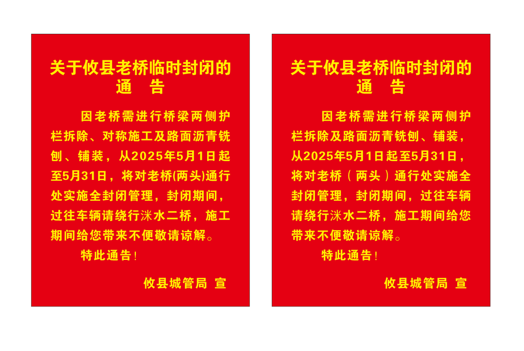 由于接下来需要对洣水一桥维修加固项目进行对称施工、路面沥青铣刨、铺装等作业,从2025年5月1日起至5月31日,施工单位决定对洣水一桥两头通行处实施全封闭管理,正式进入全封闭施工阶段。在施工现场记者看到,洣水一桥桥头已经设置了交通管制通知公告牌。