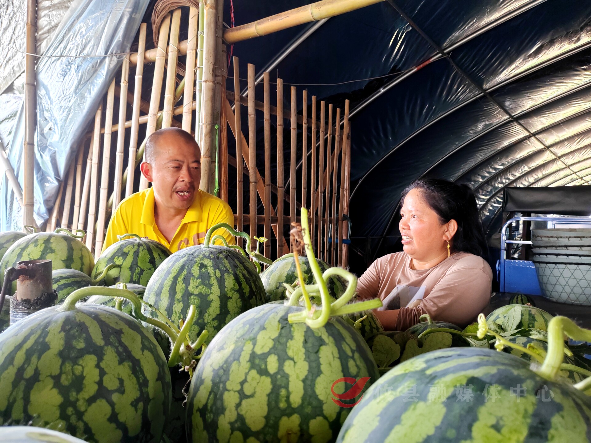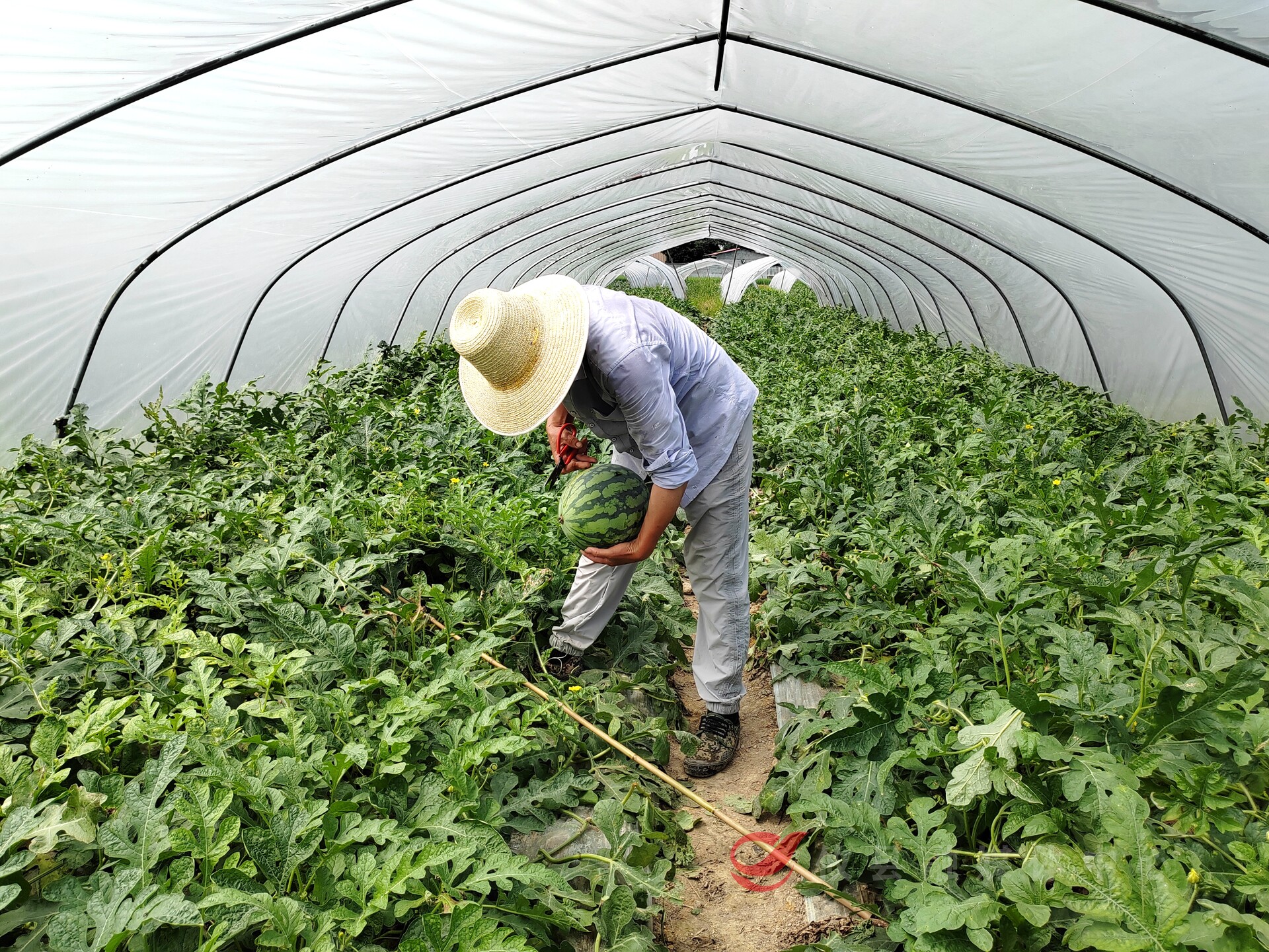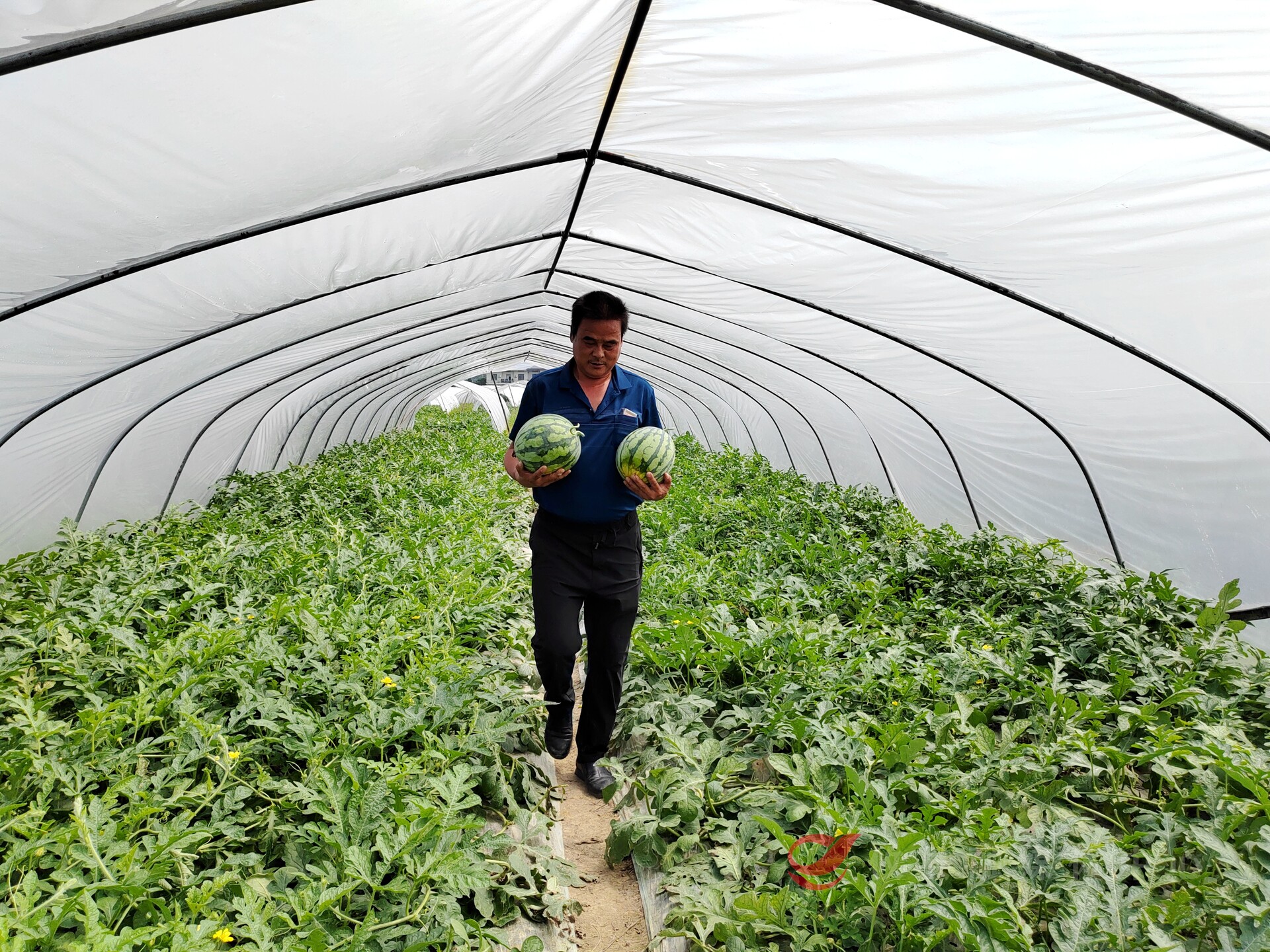 上云桥村美都西瓜基地负责人贺菊香:“头批西瓜大约每亩可以产5000斤,采收到6月底。第二批还有两三天就可以上市,可以摘到10月份。”