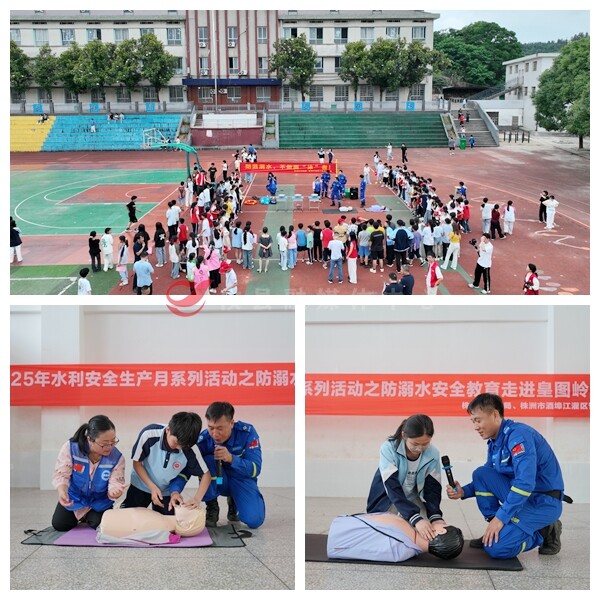 随后,攸县蓝天救援队队员通过“理论 + 实操”的方式,为学生现场讲解了溺水高发场景、危险水域识别、自救与施救等知识,应遵循“呼、叫、伸、抛”四字原则,避免意外发生。现场还演示了心肺复苏术操作步骤,并邀请同学们上台进行实操演练。他们利用模拟人道具手把手指导学生实践心肺复苏术急救方法,让大家亲身体验急救操作流程,确保将理论知识转化为应急能力。