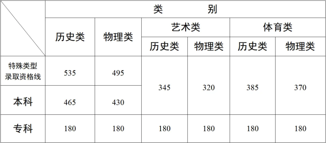 ①普通类本科线: 历史科目组合477分,物理科目组合461分; ②特殊类型招生控制线: 历史科目组合515分,物理科目组合514分。