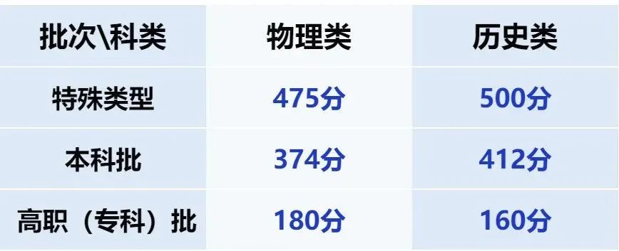 普通类录取控制分数线 一、历史类 本科批次:467分; 高职(专科)批次:150分; 特殊类型招生录取控制分数线:533分。 二、物理类 本科批次:438分; 高职(专科)批次:150分; 特殊类型招生录取控制分数线:518分。