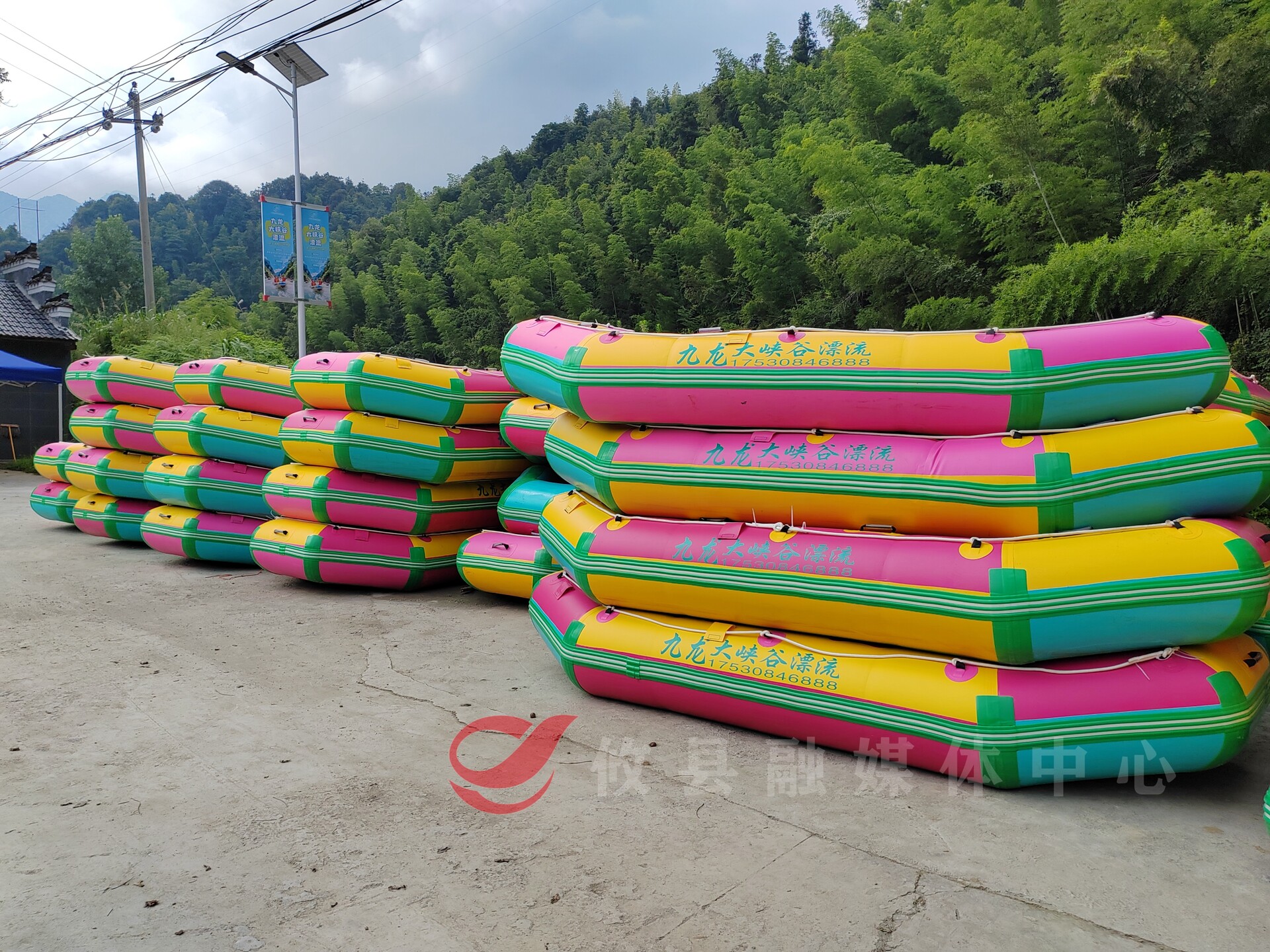攸县九龙大峡谷漂流一期项目起于鱼鳞坝,止于阳升观村部,全程6.8公里,落差68米,整体水势平缓舒适。现已配备800条6座漂流船,4台摆渡观光车。漂流开放时间为每周二、四、六、日(每周4天),线下售票时间为开放日的下午2点到5点,全程漂流时长约2小时,同时建有完善的洗浴中心,为游客提供便捷的服务。试营业截止到本月底,期间漂流享早鸟票价优惠。