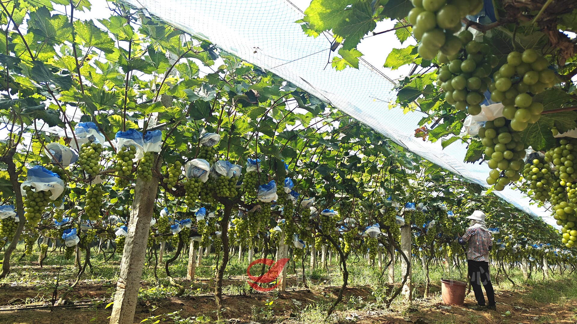 在菜花坪镇山缘农业果园内,连片的葡萄架上挂满了翠绿饱满的阳光玫瑰葡萄。果园负责人陈先生介绍,今年葡萄长势良好,具有明显的玫瑰香气和蜂蜜般的清甜口感。成熟后糖度达到26-28度,每亩产量在3000-4000斤之间。
