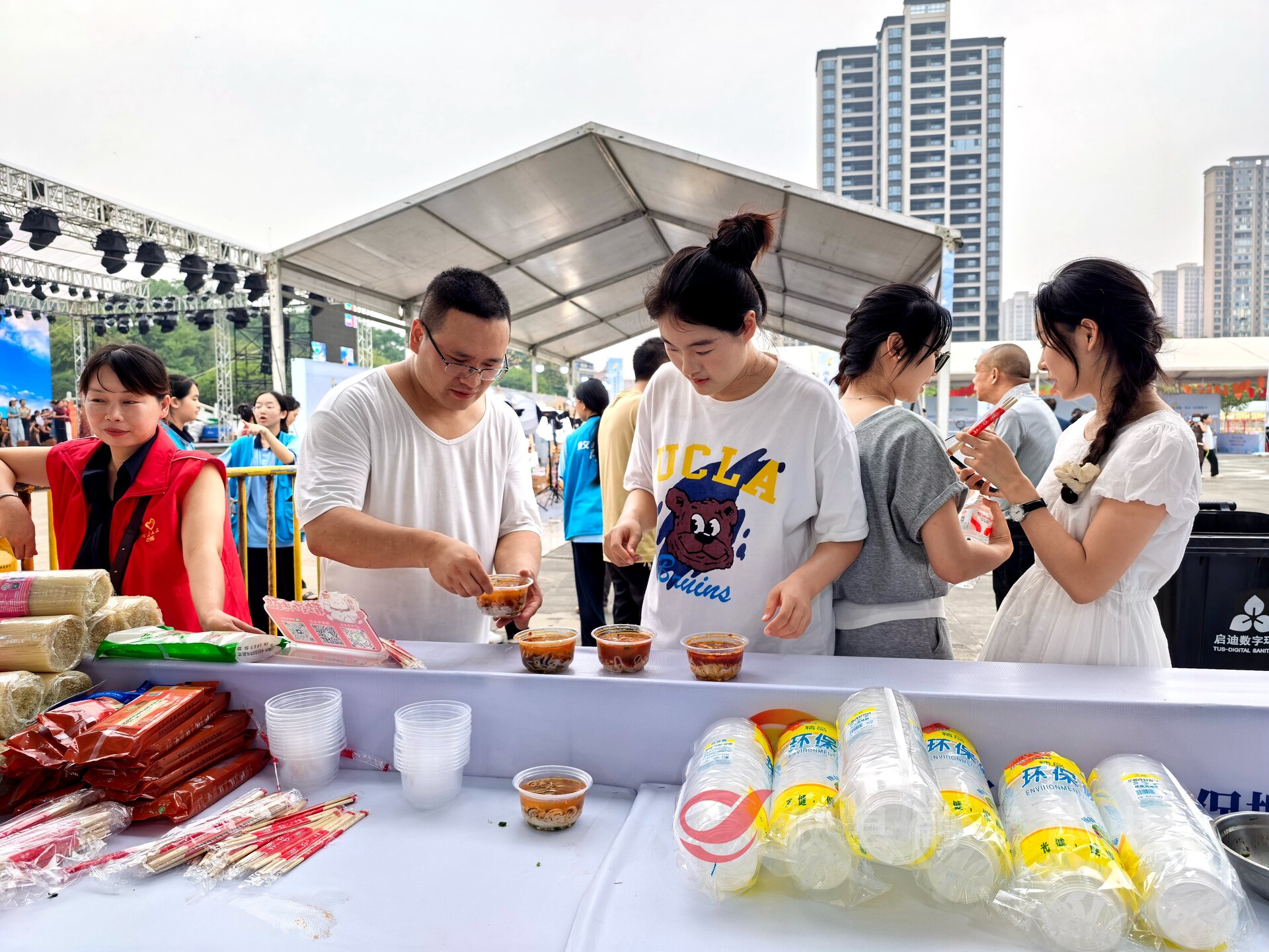9月29日下午5点,位于攸州公园内的攸县米粉免费品尝区,前来等候品尝攸县米粉的市民来了一拨又一拨。烧水、备碗、下粉、出锅……不一会,排队的市民们一个个都喜滋滋地端出一碗粉心满意足地嗦起来。