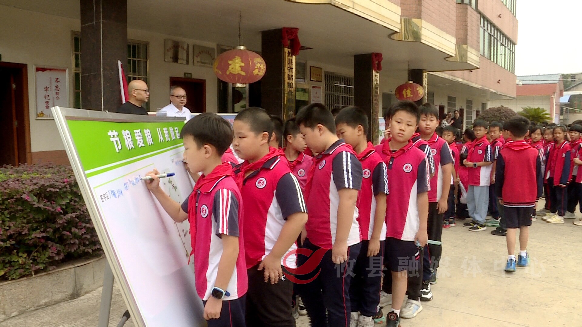 在湖南攸县省储粮食购销有限责任公司,来自县城文化路小学的学生们首先进行了集体宣誓,在“节粮爱粮”宣言展板上签名,承诺节约粮食。在粮食安全宣传教育基地和粮库展厅,学生们观察水稻、玉米等作物种子,深入了解粮食从种植到收获再到“盘中餐”的全过程,以及储存过程中防虫、防霉等知识。随后学生们有序步入平日充满神秘感的储粮仓房,工作人员向大家讲解了现代化的智能通风、低温储粮、害虫防治等绿色科技储粮技术。