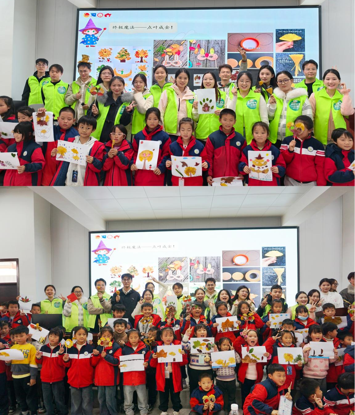 生态“攸”我宣讲团以“变废为宝”为课程主线,创新打造“垃圾魔法师”沉浸式课堂。在“垃圾宝宝找家”互动游戏中掌握四分类标准,将分类知识转化为“看得见、摸得着”的实践能力。核心环节设置“自然手作工坊”,指导学生以小组为单位,利用落叶、枯枝等自然材料,创作树叶贴画、环保手工花、树叶面具等生态艺术品,让废弃物焕发新生。课程尾声,全体学生庄严宣誓成为“环保小卫士”,承诺将所学知识转化为日常行动。这种“做中学、学中做”的模式,让生态文明教育从课堂走向生活,从理论转化为实践,真正实现了知行合一。