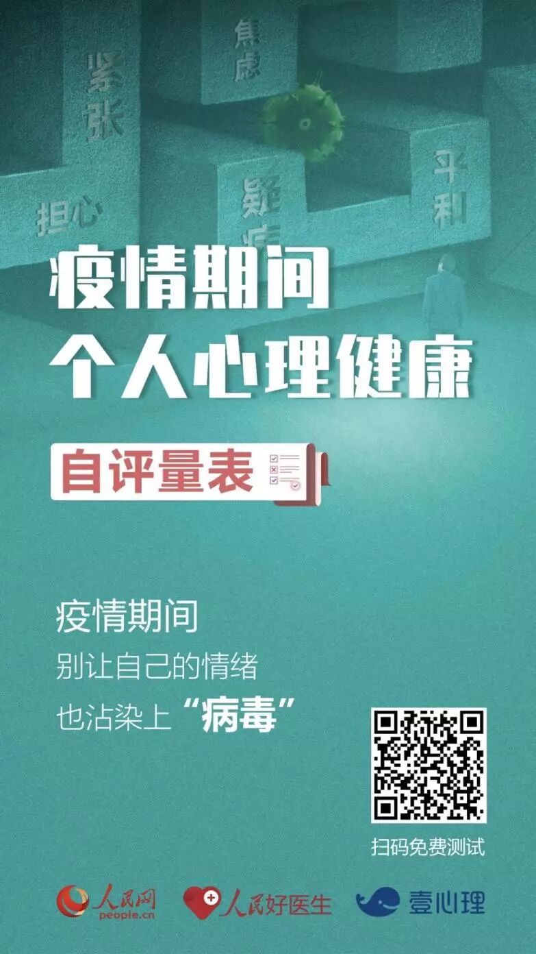 新冠肺炎时刻牵动着全国人民的心。由于疫情,大家的正常生活和工作受到一定的影响,可能会出现焦虑、害怕以及恐慌等情绪。连日来,你是否无法辨别各种各样的疫情信息?是否感到心理状态和生活节奏被完全打乱?长时间“宅”在家里是否感到无措?……人民网“人民好医生”客户端联合壹心理推出《疫情期间心理健康自评量表》,带给你温暖而专业的解答。 疫情期间,做好心理防护,别让自己的情绪也染上“病毒”! 让我们调节自己的情绪,为自己加油,为中国加油!我们坚信,只要大家共同努力,我们就能更好更快地战胜病毒,打赢这场疫情防控阻击战! 扫描下方二维码开始自测 下载人民好医生客户端,获取疫情公益心理援助专线服务