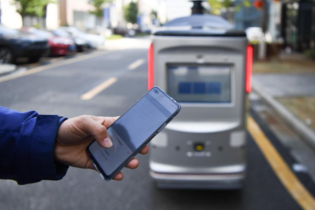 工作人员用手机控制无人配送车的送餐目的地(2020年2月14日摄)。新华社记者薛宇舸 摄