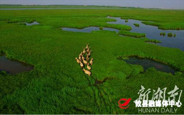 航拍位于东洞庭湖国家自然保护区内的麋鹿群。