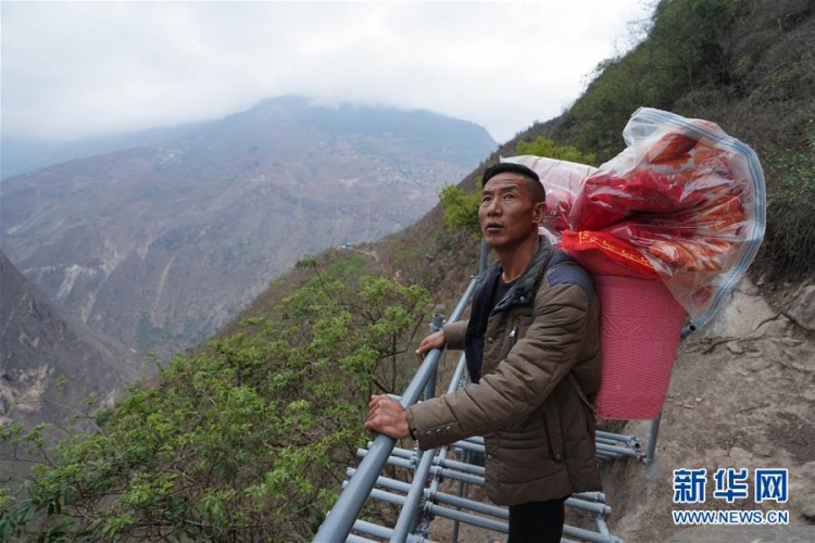 5月13日,即将搬入昭觉县易地扶贫搬迁县城集中安置点的莫色达体背着行李在下山途中休息,不时回头向“悬崖村”仰望。新华社记者 江宏景 摄