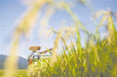 2022年7月,湖南永州道县四马桥镇金狮头村的农民正驾驶大型机械收割早稻。