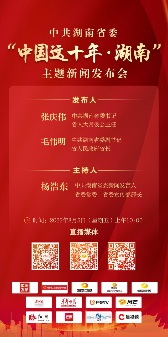 “中国这十年·湖南”主题新闻发布会将于2022年8月5日10时在长沙举行。中共湖南省委书记、省人大常委会主任张庆伟,中共湖南省委副书记、省长毛伟明出席,介绍有关情况并答记者问。中共湖南省委新闻发言人,省委常委、省委宣传部部长杨浩东主持。