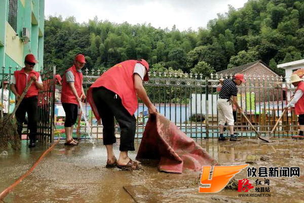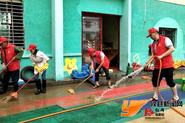为了给山关村辖区内居民一个干净卫生的人居环境,当地党员和志愿者们分工协作,带上铁铲和扫把等工具,将垃圾和淤泥集中扫成一堆及时清运。与此同时,志愿者们帮着将受灾幼儿园内的用品全部搬出室外,将室内和操场进行清洗和消毒处理。