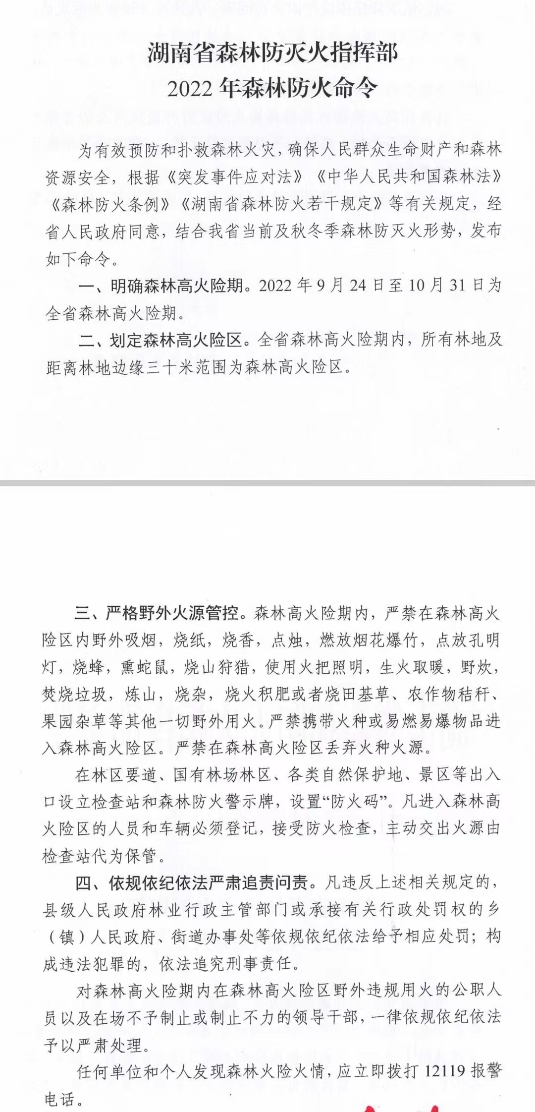 湖南日报9月27日讯(全媒体记者 奉永成)今天,湖南省森林防灭火指挥部(简称“省森防指”)发布2022年森林防火命令,明确森林高火险期、划定森林高火险区,要求严格野外火源管控,依规依纪依法严肃追责问责。