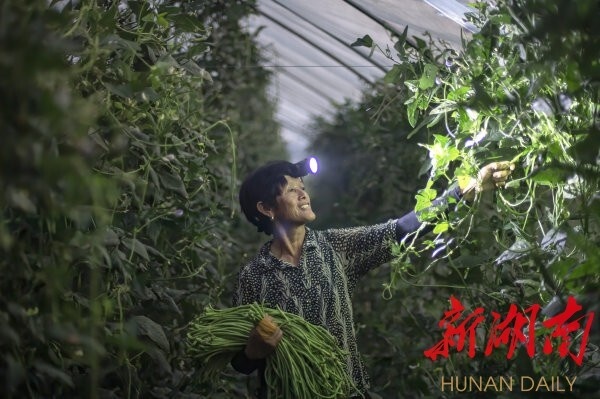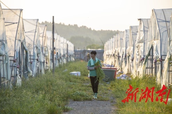 (8月24日5时许,祁阳县茅竹镇三家村德辉农场蔬菜大棚里,村民肖红艳已经忙活一个多小时了。湖南日报记者 辜鹏博 摄)