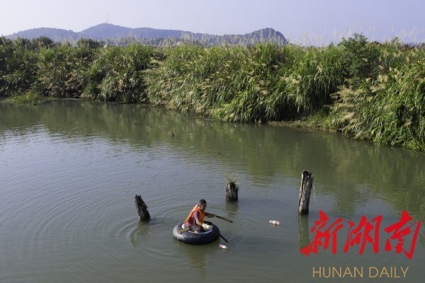 (8月24日,祁阳县茅竹镇三家村,村民萧学金坐在自制的“轮胎船”上打捞水面上的垃圾。他和老婆一起负责河道清洁,每个月工资3000元左右。湖南日报记者 辜鹏博 摄)