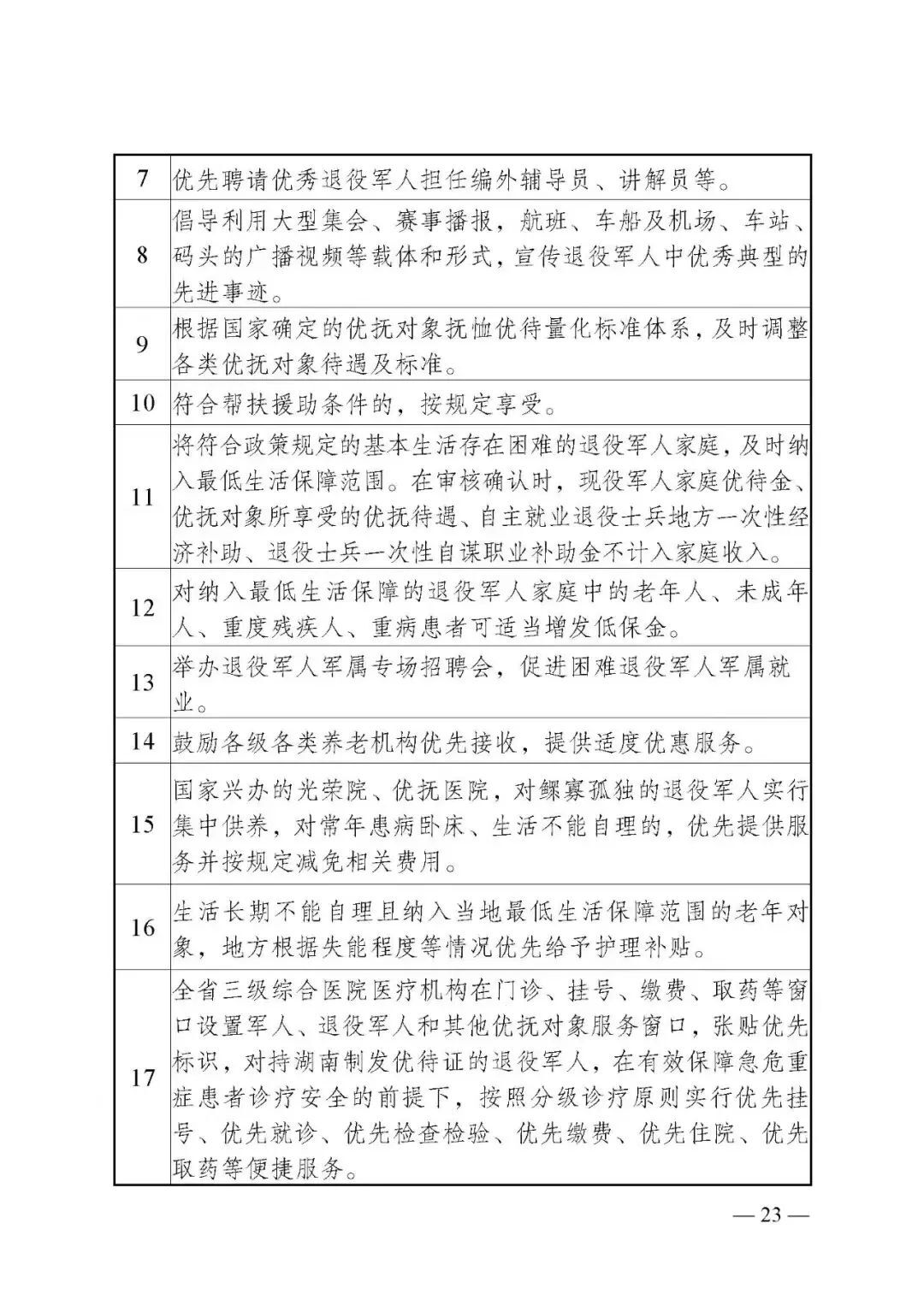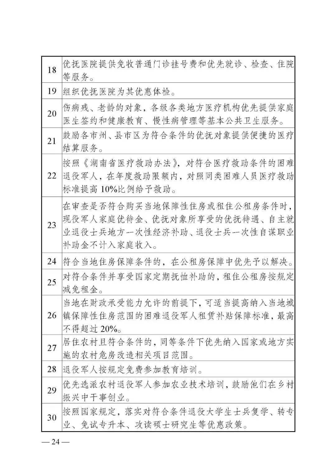 《实施意见》深入贯彻落实习近平总书记关于退役军人工作重要论述,适应国家经济社会发展、国防和军队建设的新形势,结合我省实际,以国家116条优待目录清单为基础,并创新拓展了生活、医疗、交通等部分优待内容,明确荣誉激励、生活优待、养老优待、医疗优待、住房优待、教育优待、文化交通优待、其他优待等8个方面优待项目,建立起具有湖南特色的优待工作内容体系。