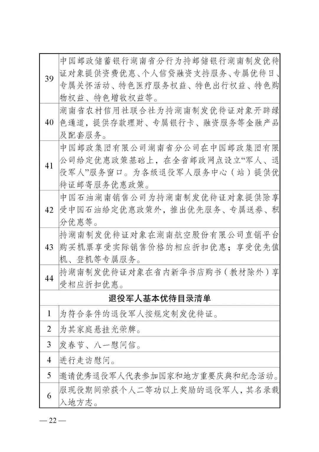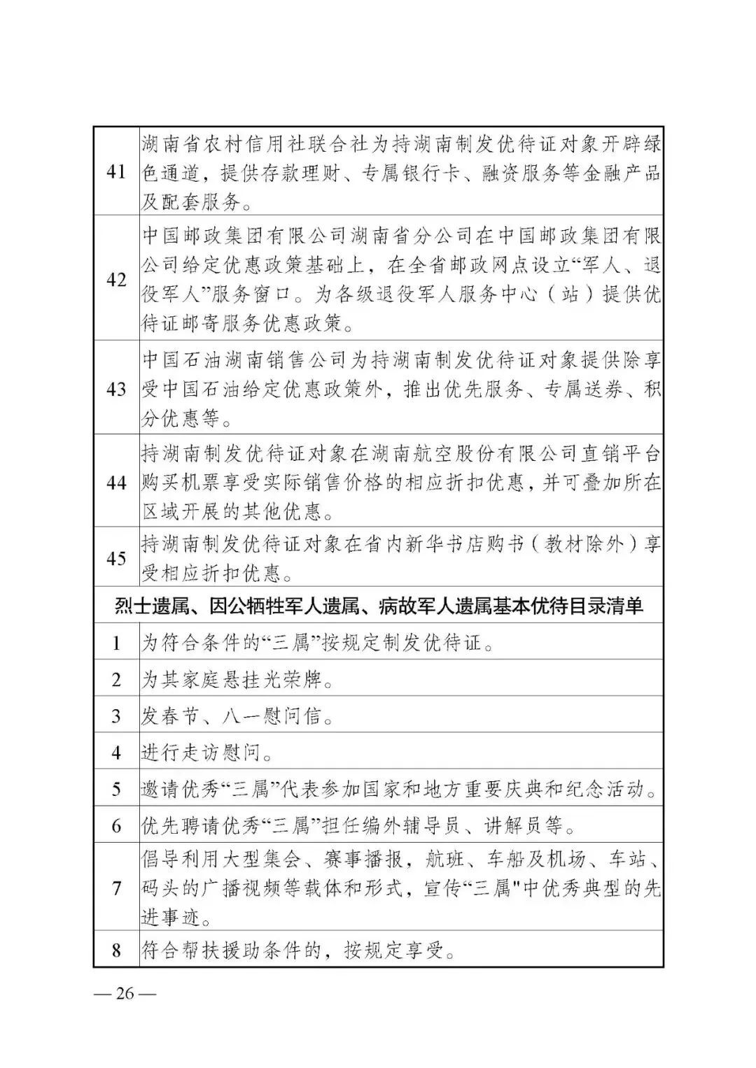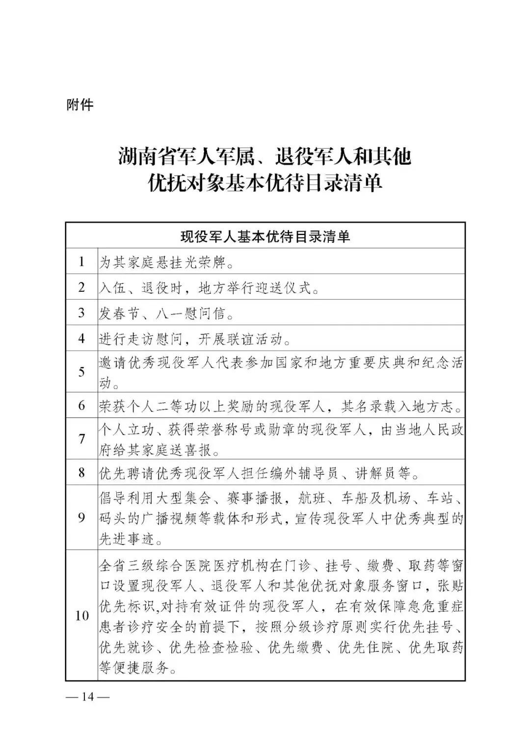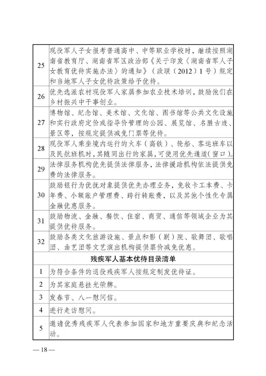 近日,省退役军人事务厅等24部门联合印发《湖南省加强军人军属、退役军人和其他优抚对象优待工作的实施意见》(以下简称《实施意见》),明确了我省军人军属、退役军人和其他优抚对象基本优待目录清单,共180条,顺应广大优抚对象对美好生活的新期待。