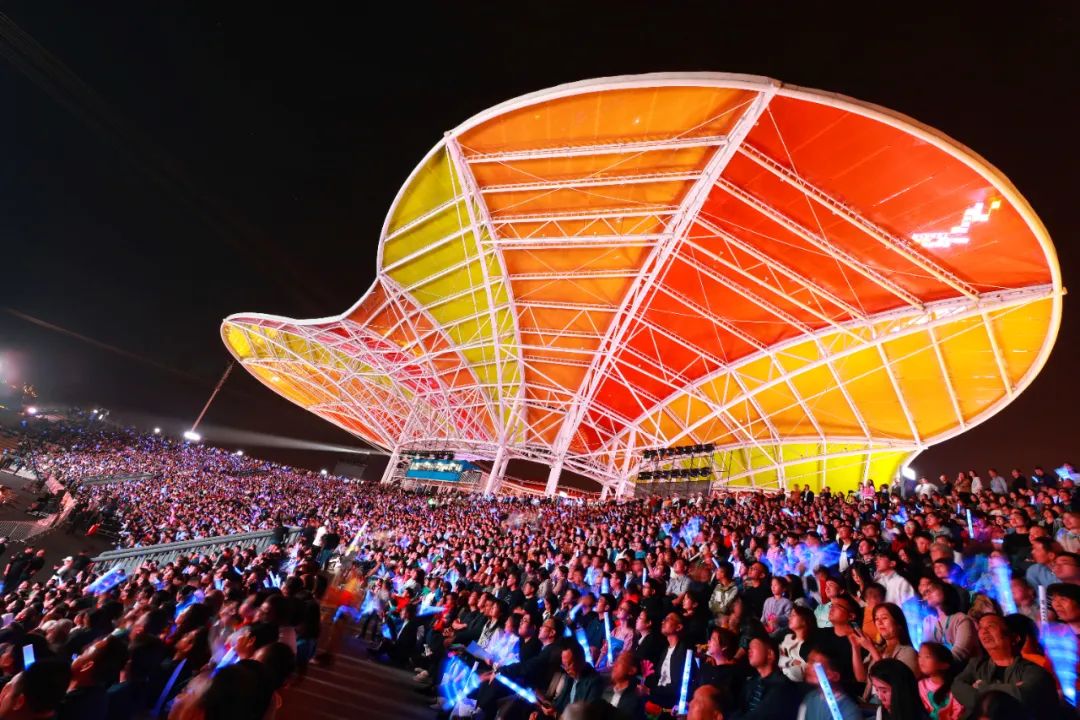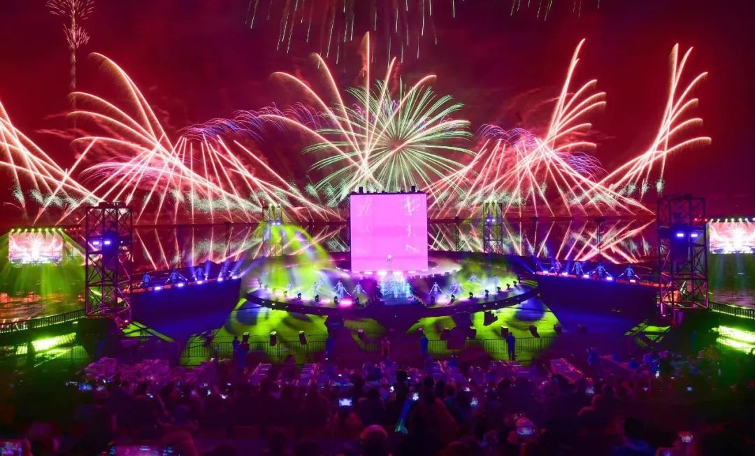 中国女高音歌唱家、国家一级演员陈思思领衔演唱《浏阳河》,九区县(市)文旅代表与现场观众同声共应,天幕焰火扑面而来,金色瀑布飞流直下,“万人同唱浏阳河”“九曲银河落九天”的互动场景拉开沸腾的序幕。