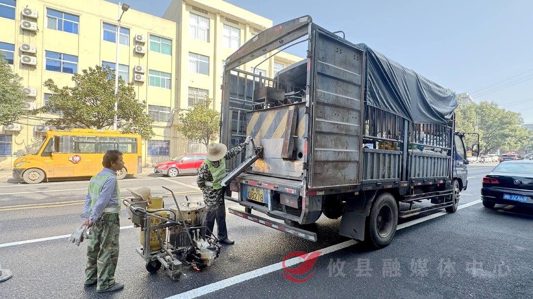在文化路一中路段,施工人员正推着重达300多斤、温度高达200度的热熔划线车,默契地进行测量、标记、划线等工作,重新施划清晰的标线。并且此次在原材料上严格要求,使用特制高亮反光玻璃珠,让重新补划的标线更加清晰、规范,大大提升了夜间行车安全。