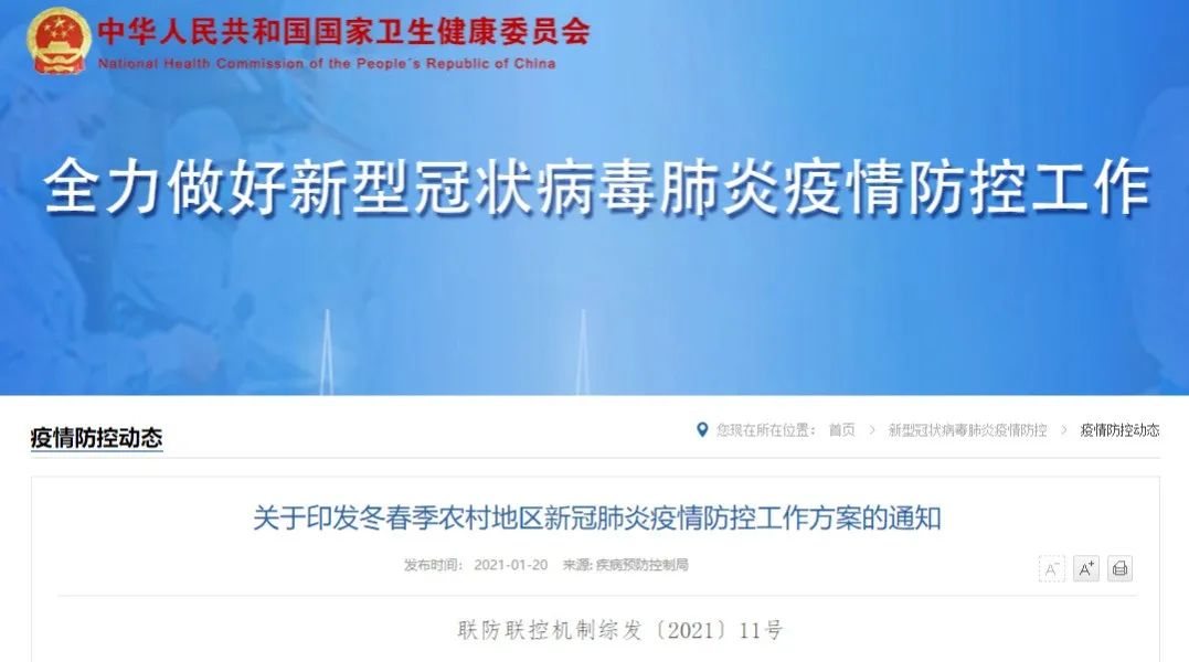 同一天,1月20日,国家卫健委网站发布《冬春季农村地区新冠肺炎疫情防控工作方案》。《方案》指出: